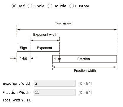 This structure implements the datatype for storing half-precision floating-point numbers. The structure implements assignment, arithmetic and comparison operators, and type conversions. 16 bits are being used in total: 1 sign bit, 5 bits for the exponent, and the significand is being stored in 10 bits. The total precision is 11 bits. There are 15361 representable numbers within the interval [0.0, 1.0], endpoints included. On average we have log10(2**11) ~ 3.311 decimal digits.